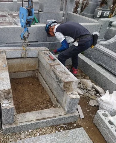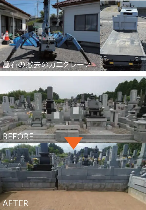 1・2級土木施工管理技士の資格を持つ「解体のプロ」が、責任を持って安全かつ丁寧に撤去・解体を行います。基礎部分や外柵の解体、地面の整地まで、最後までしっかり対応します。墓石の撤去には、「カニクレーン」(画像上)を使用。土葬の掘り起こしなど重機が使用できない場合は、手作業で確実に対応します。