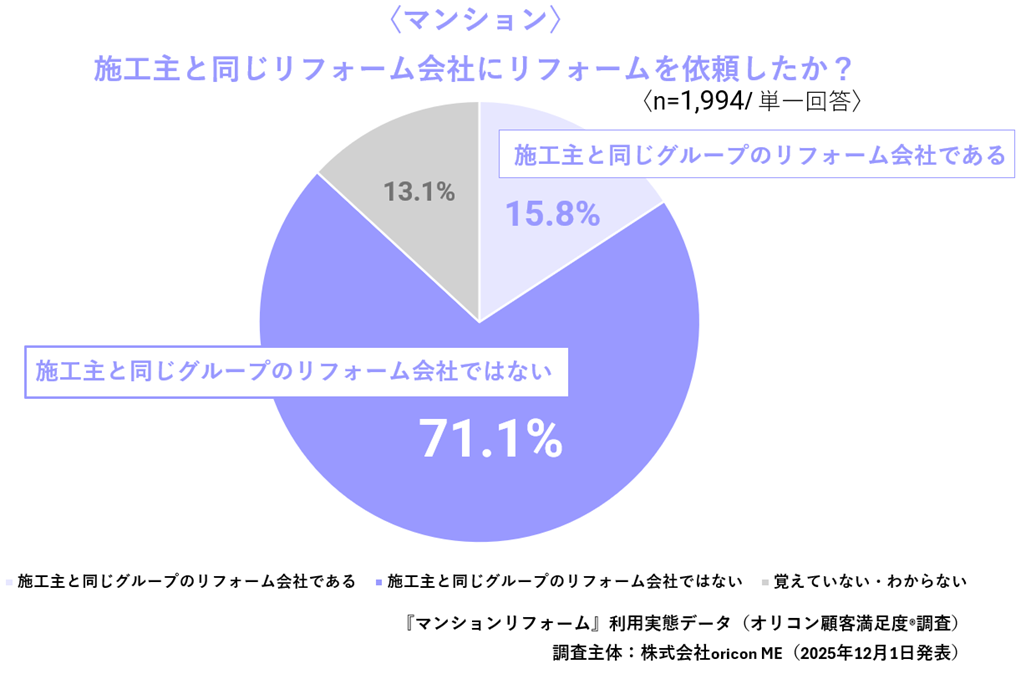 過去3年以内に、自身が居住するマンションのリフォームを行った依頼者1,994人に「リフォームを依頼した会社は施工主と同じグループのリフォーム会社か?(単一回答)」と聴取したところ、「施工主と同じグループのリフォーム会社ではない」が71.1%で最多となりました。「施工主と同じグループのリフォーム会社である」は15.8%と低い割合となっています。