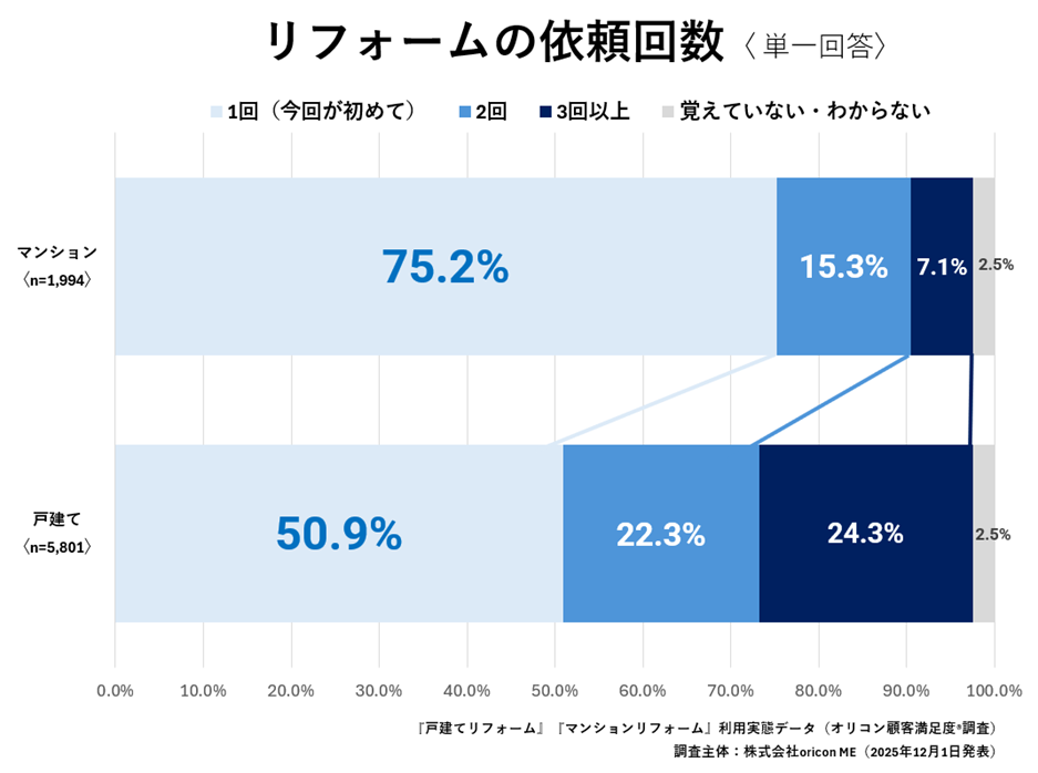 \ 実際の利用者8,713人が回答 /オリコン顧客満足度®調査 『リフォーム』利用実態データ■リフォームの依頼回数 「マンション」は1回が75.2%で最多 (オリコン顧客満足度®調査)