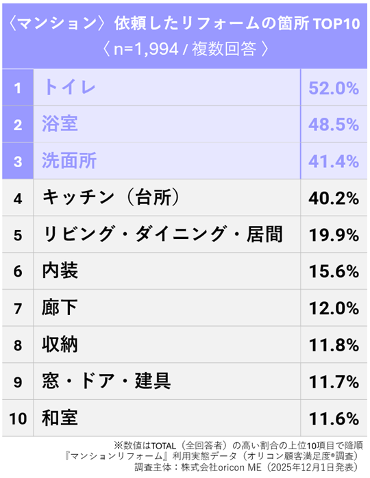 ・『マンション』『戸建て』ともに「トイレ」が最多 『フルリフォーム』では「キッチン(台所)」が最多に