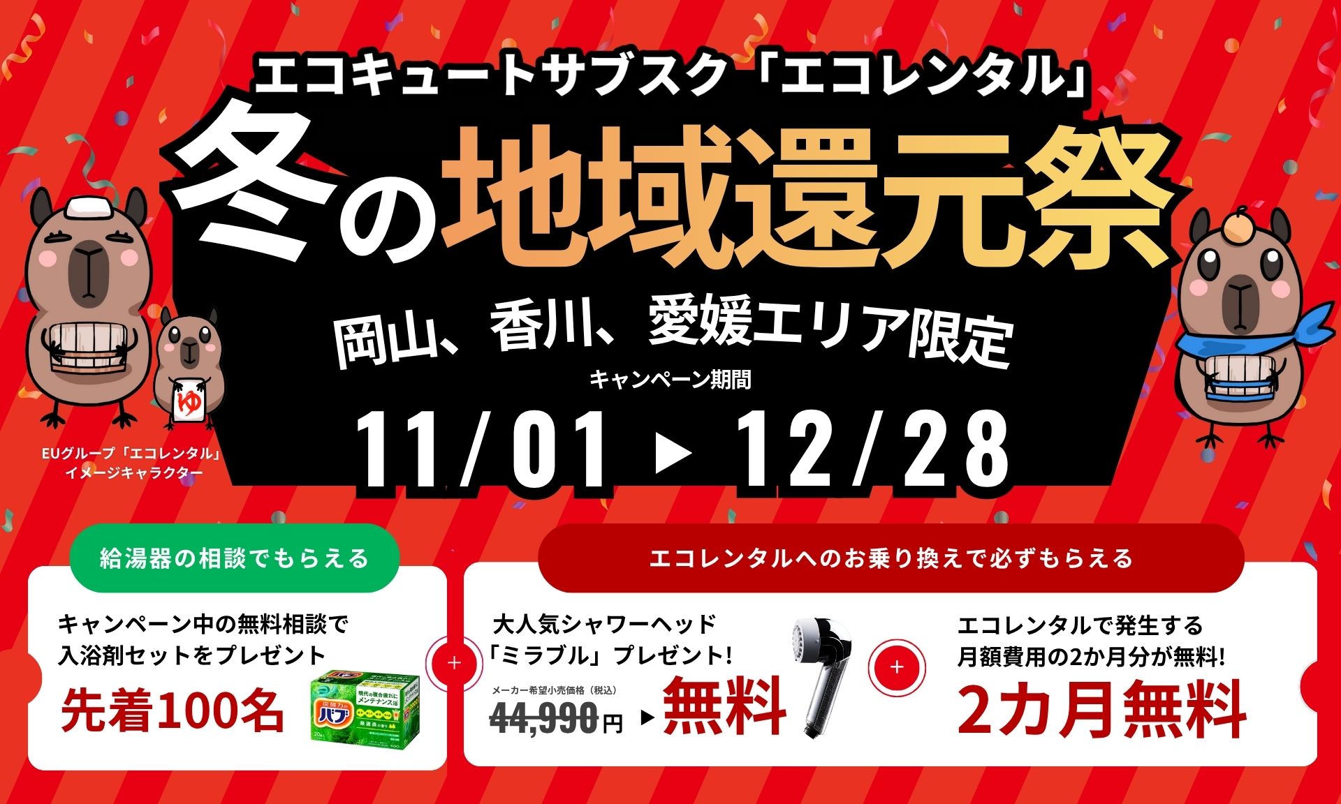 寒波の影響により全国で給湯器の凍結トラブルが増加する中、中四国地方でエコキュートのサブスク「エコレンタル」を展開するEUグループ株式会社(本社:岡山県倉敷市、代表:河合 雄治)は、家庭で実施できるエコキュートの凍結予防対策をウェブサイトで公開し注意喚起を実施しています。