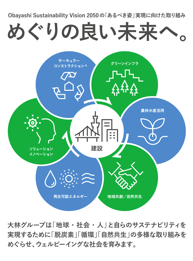 大林グループは本取り組みに加え、リサイクル材やリユース材の使用促進や生物環境の保全に寄与する環境配慮設計などを推進しています。「地球・社会・人」と自らのサステナビリティを実現するために「脱炭素」「循環」「自然共生」の多様な取り組みを展開することで、ウェルビーイングな社会の形成に貢献していきます。