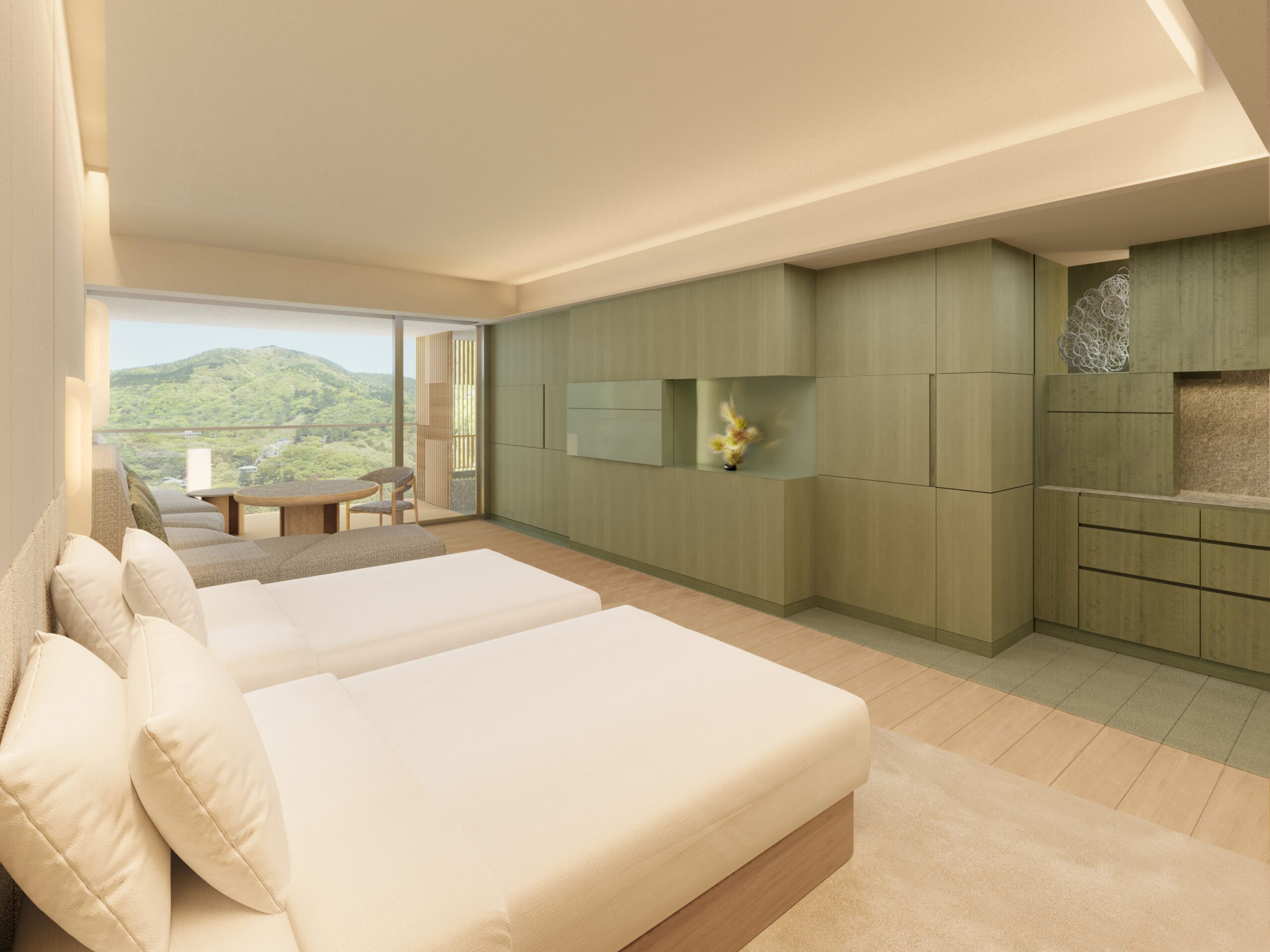 ホテル全体のデザインは、フランス出身デザイナーのグエナエル・ニコラ氏が率いるデザインスタジオ「キュリオシティ」が担当。“Forest Hideaway”をコンセプトに、強羅の豊かな自然環境と調和する、洗練された空間を創出します。温かみのあるグリーンとベージュを基調とした館内には、ロビー、客室、大浴場など、どこにいても視線の先に箱根の山々を感じられるよう、開放的な窓を設けております。自然と静かに向き合う、リゾートならではのひとときをお過ごしいただけます。