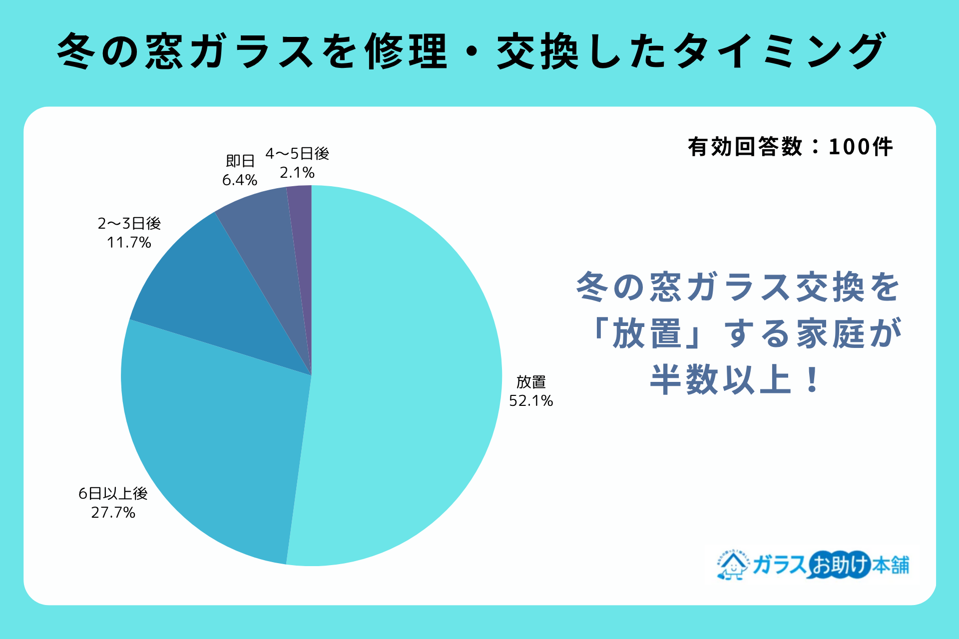 次に、冬の窓ガラスを修理・交換したタイミングについて聞くと、「放置」が52.1%で最多だったことが明らかになりました。
