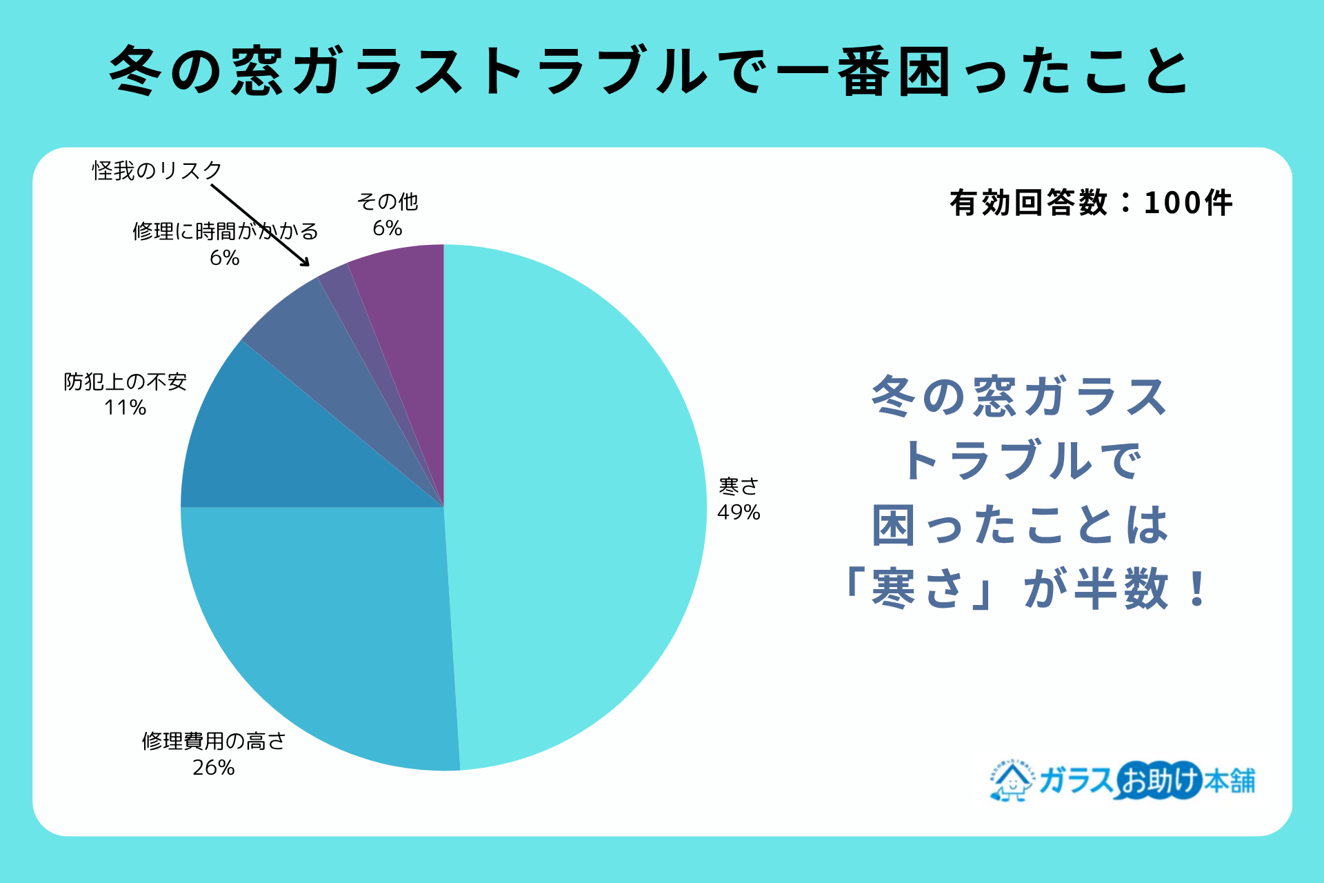 冬の窓ガラスのトラブルが起きた時に最も困ったことを聞くと、「寒さ」が49%と半数近くを占める結果となりました。