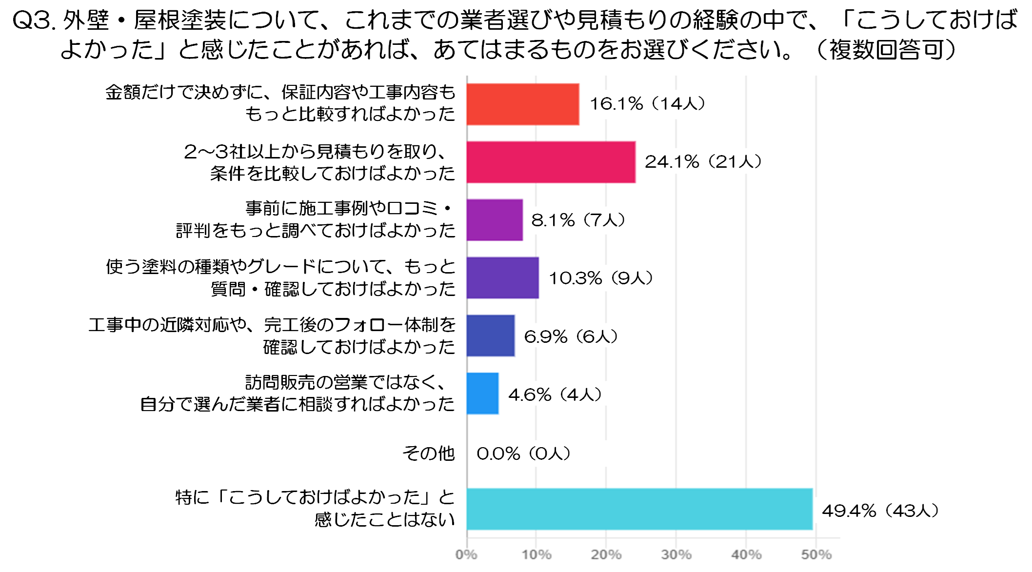 - また、「使う塗料の種類やグレードについて確認しておけばよかった」10.3%(9人)や、「施工事例や口コミ・評判をもっと調べておけばよかった」8.1%(7人)など、情報収集が十分でなかった点を悔やむ声も見られます。