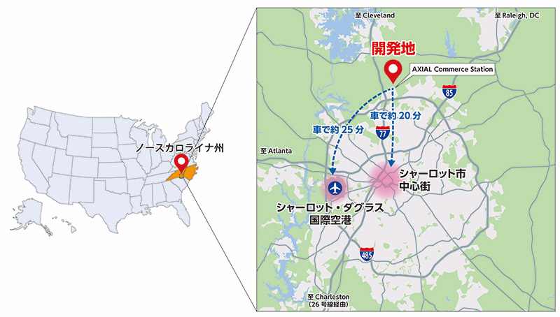 本物件はシャーロット市の中心街から車で約20分、シャーロット・ダグラス国際空港から車で約25分のハンターズビル市に位置します。米国南東部を横断する主要高速道路I-85をはじめ、I-77や環状線I-485に近接する輸送効率に優れた立地によりアトランタ、ニューヨーク、シカゴなどの主要都市へ1~2日で配送可能です。本物件周辺には世界最大級のテクノロジー企業であるアマゾンや家庭用消費財メーカーのレイノルズの物流施設があり、物流サービスの需要は非常に旺盛です。