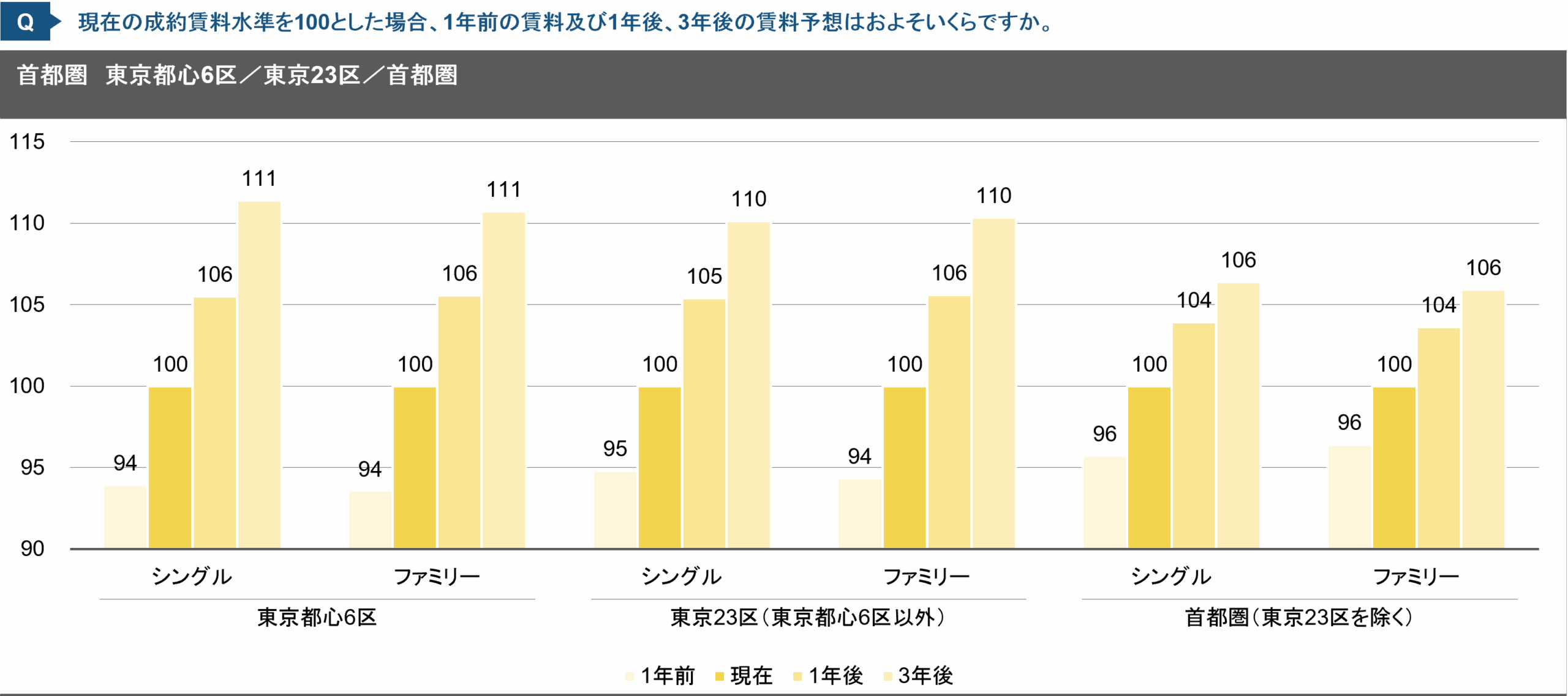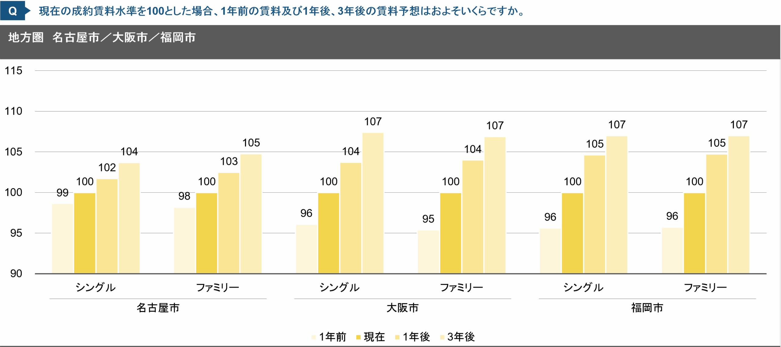 • 首都圏では、シングル、ファミリーともに賃料上昇が続くと見込まれている。エリア別では都心に近いほど上昇率が大きい傾向がある。部屋タイプ別では、同程度の上昇率である。地方圏においても、シングル、ファミリーともに調査対象である全ての都市(名古屋市、大阪市、福岡市)で賃料上昇が見込まれている。