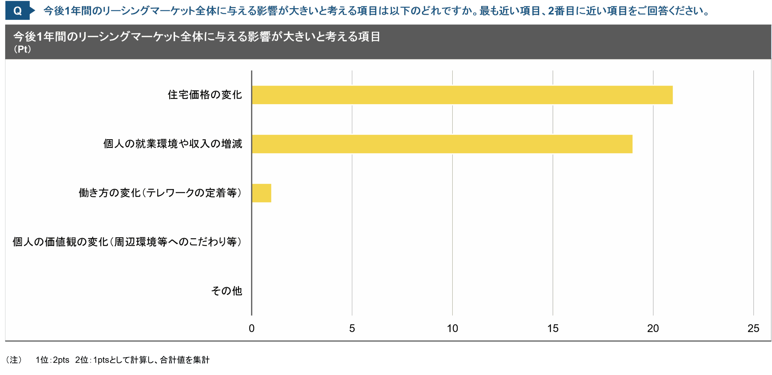 • 今後1年間のリーシングマーケット全体に与える影響が大きいと考える項目について「住宅価格の変化」、「個人の就業環境や収入の増減」が上位回答となった。住宅価格の上昇による賃貸ニーズの高まり(特にファミリータイプ)を指摘する声が聞かれた。