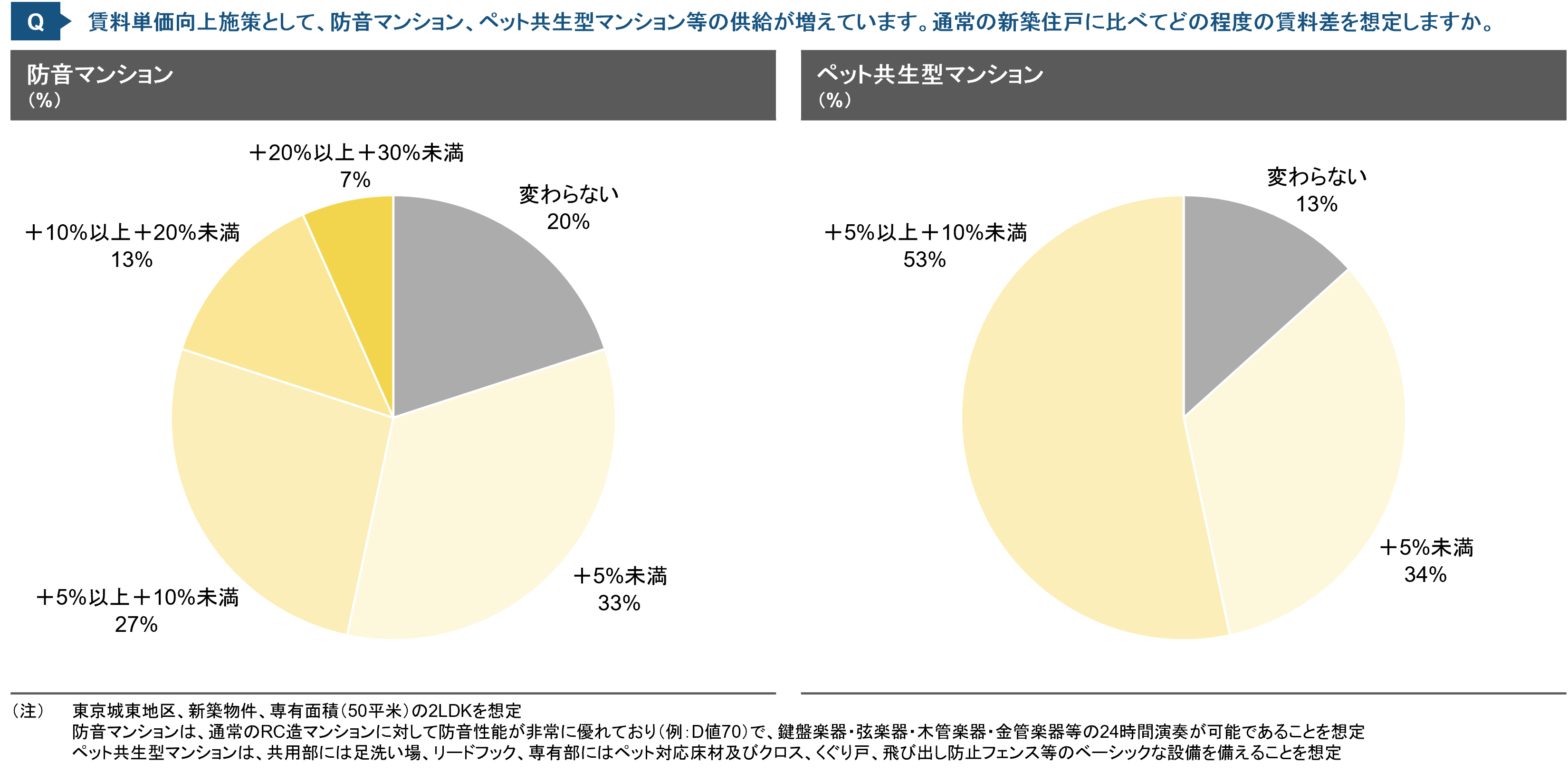 • 防音マンション、ペット共生型マンションの通常の新築住戸との賃料差について、いずれも上位回答は「+5%未満」「+5%以上+10%未満」だった。防音マンションについては、「+10%以上+20%未満」、「+20%以上+30%未満」の回答も2割あった。