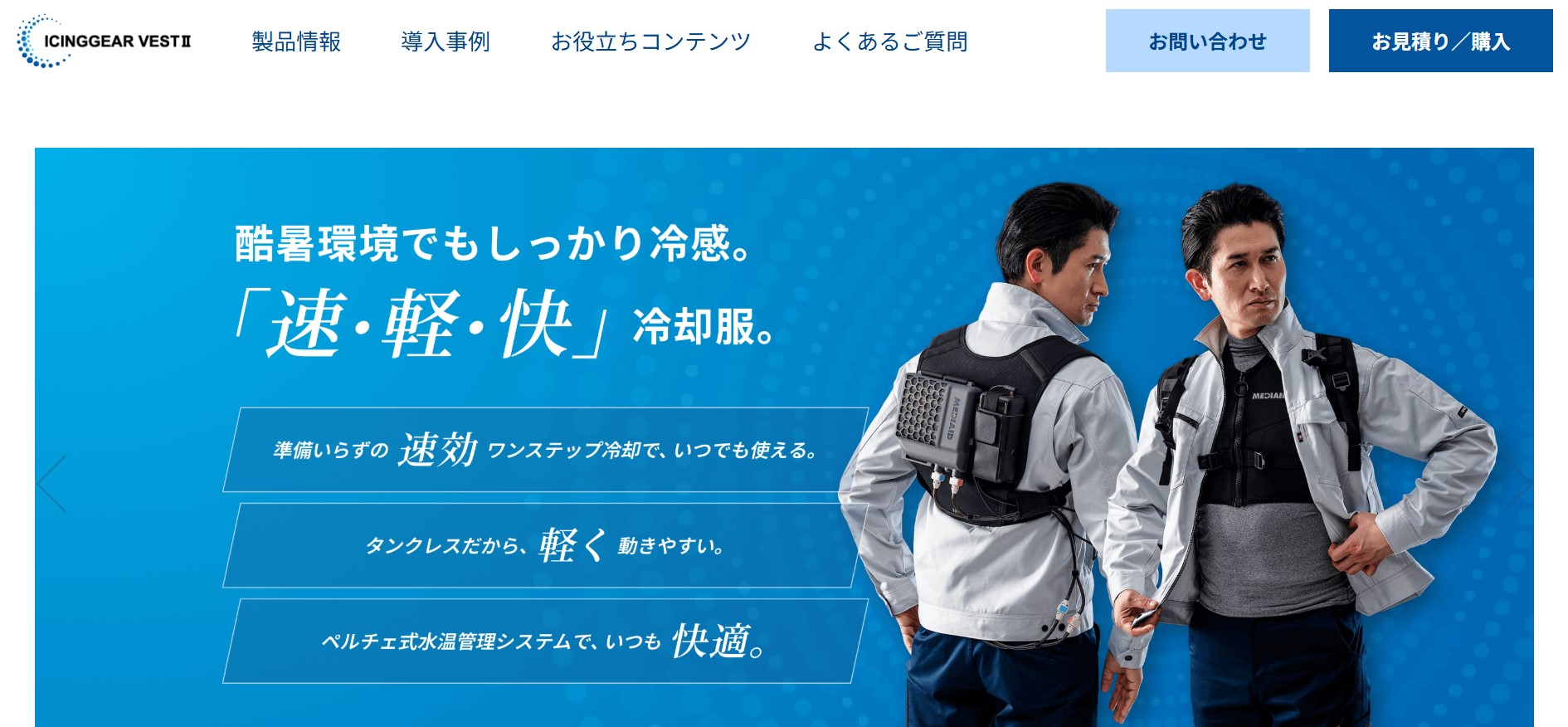 当社はこれまで医療現場で培ってきたノウハウを活かし、従業員自身を直接冷やす製品等を開発・発売してまいりました。これらの知見を基に、本サービスサイトを通じてペルチェ式冷水循環服「メディエイド アイシングギア ベスト2」がどのような課題解決に貢献できるのかをご紹介するとともに、暑さ対策に悩むすべての方にお役立ていただけるコンテンツも発信してまいります。