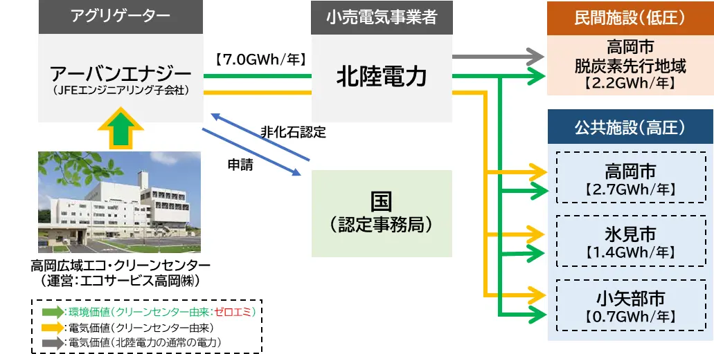 北陸電力は、高岡広域エコ・クリーンセンターで発電されたゼロカーボンの余剰電力を地産地消に活用するため、高岡市・氷見市・小矢部市の公共施設等へ供給する役割を担います。