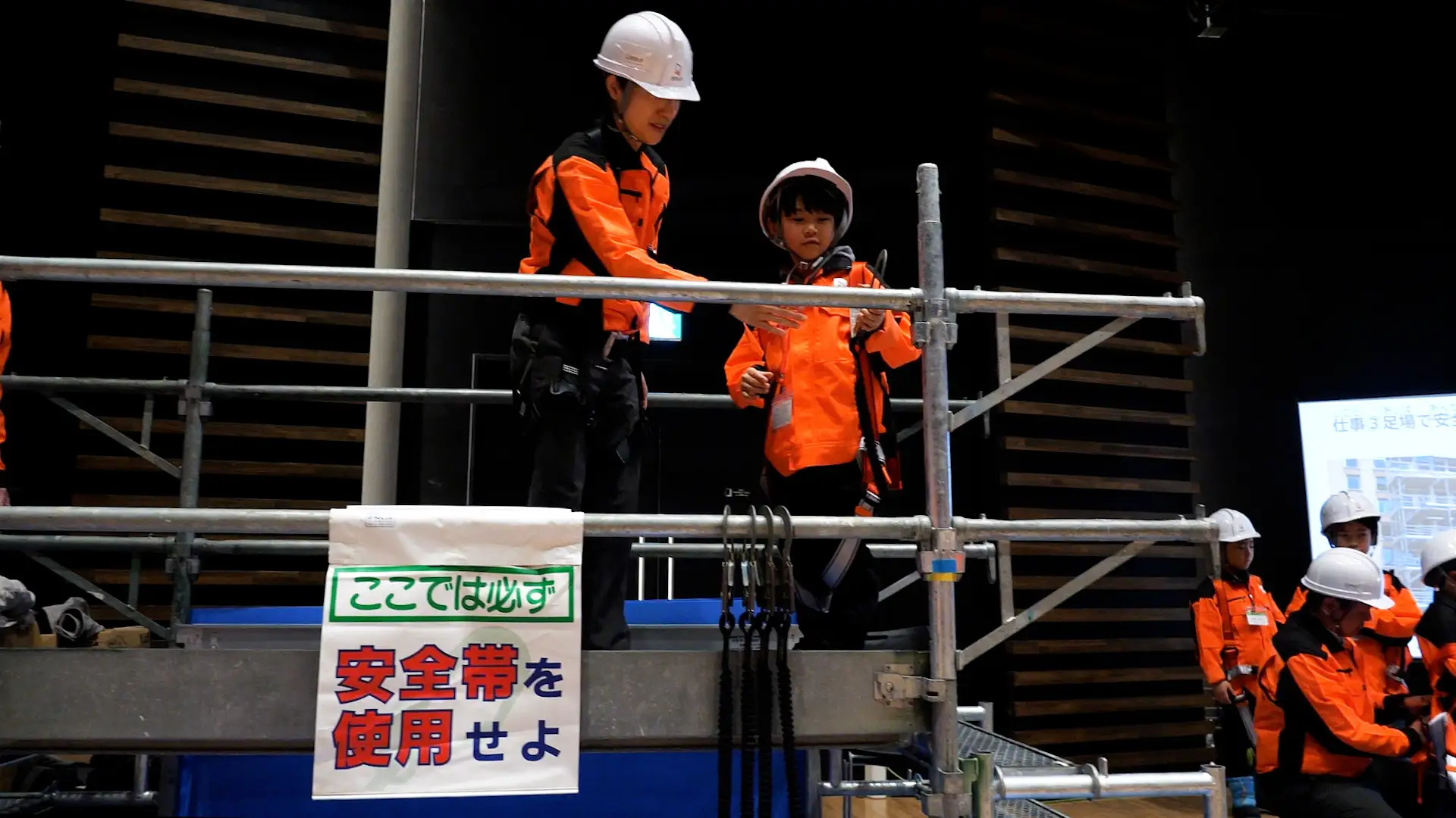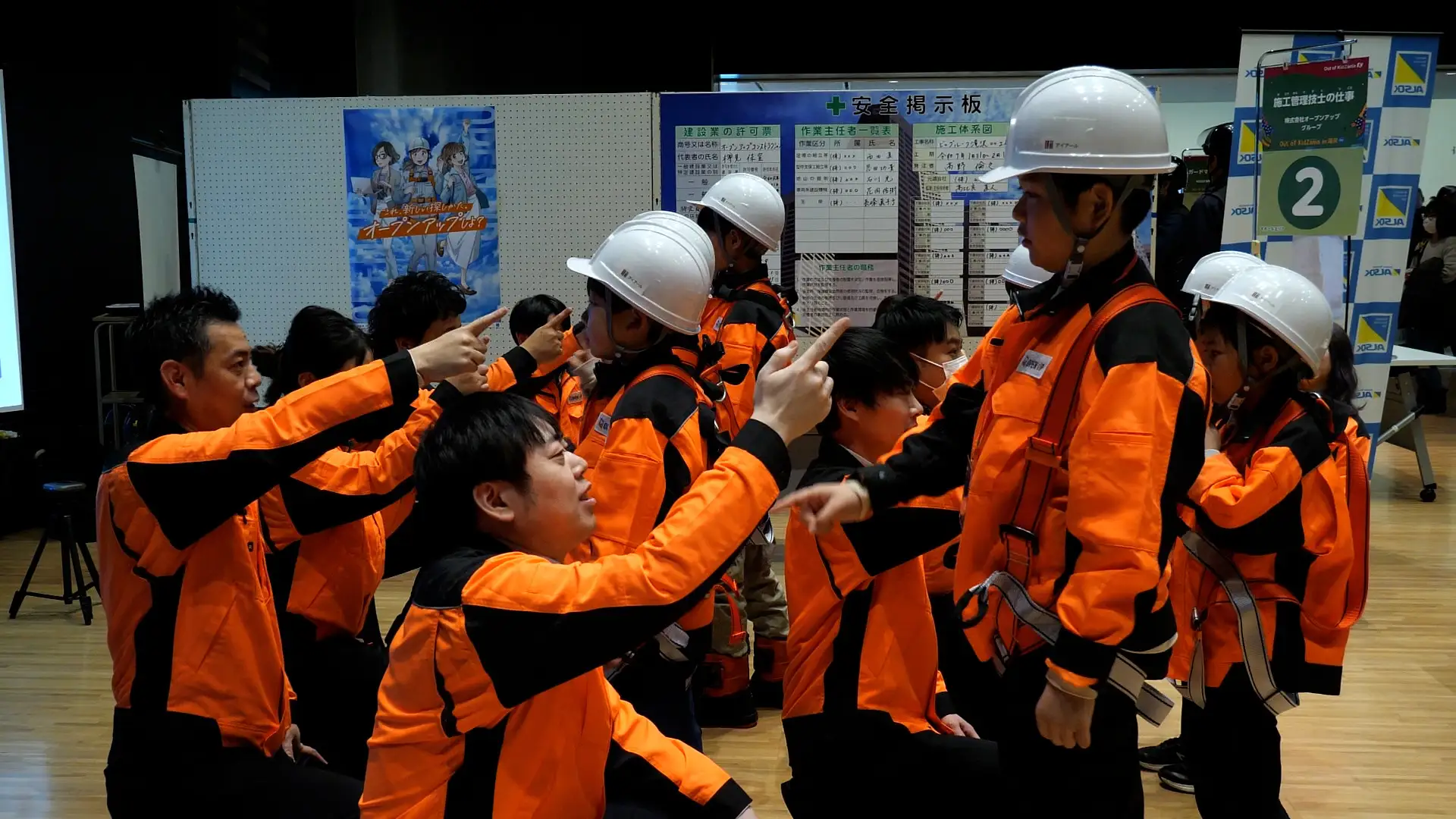 1.建設現場の装備を着⽤した朝礼体験 2.安全帯を使⽤した⾼所作業体験