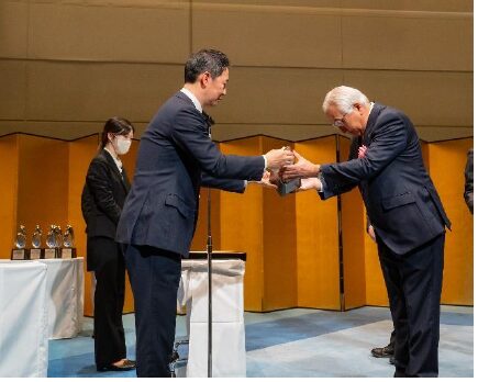 表彰式にてトロフィーを受け取る大嶋東京本社代表兼技術本部長