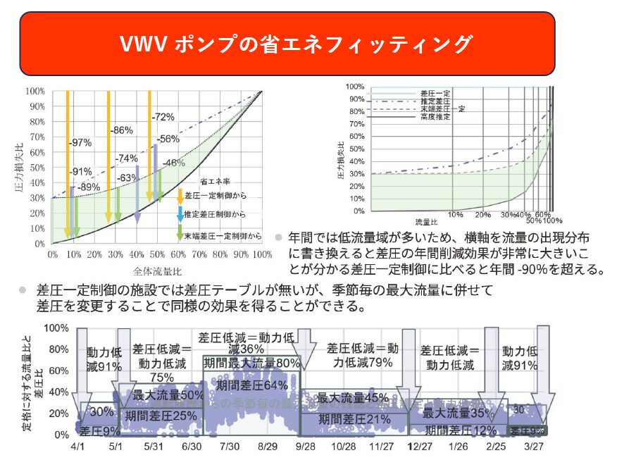 従来、既存設備において空調機の変風量(VAV)制御や冷温水ポンプの変流量(VWV)制御は一般的な省エネ制御として知られています。しかし実際には、必要以上の風量や差圧で運転されているケースが多く、ムダに気付かれないまま運用されていました。