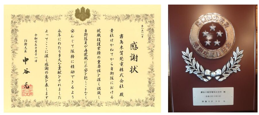 霧島木質発電株式会社、退職自衛官の就職援護に貢献し防衛大臣感謝状を拝受