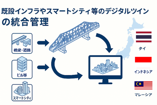 ASEAN諸国では、急速な経済発展に伴う新設インフラの整備に加え、既設インフラの老朽化対策が急務となっています。 一方で、3Dデータを用いたアセットマネジメントの商業的導入や制度化は未整備な領域が多く、高度な管理スキームの構築が求められています。