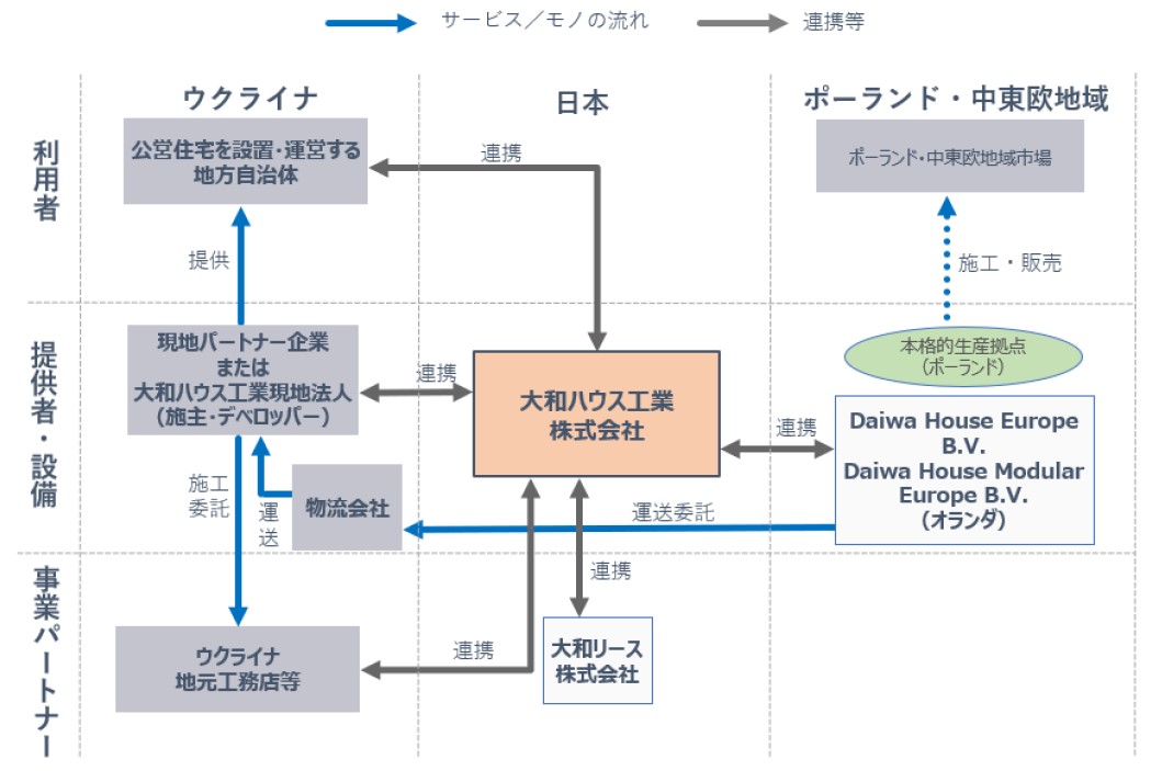 当事業においては、当社が創業以来培ってきたプレハブ技術を活用した住宅の仮設生産施設をポーランドに設置し、同国からウクライナへ輸送、建設、供給を行う予定としています。