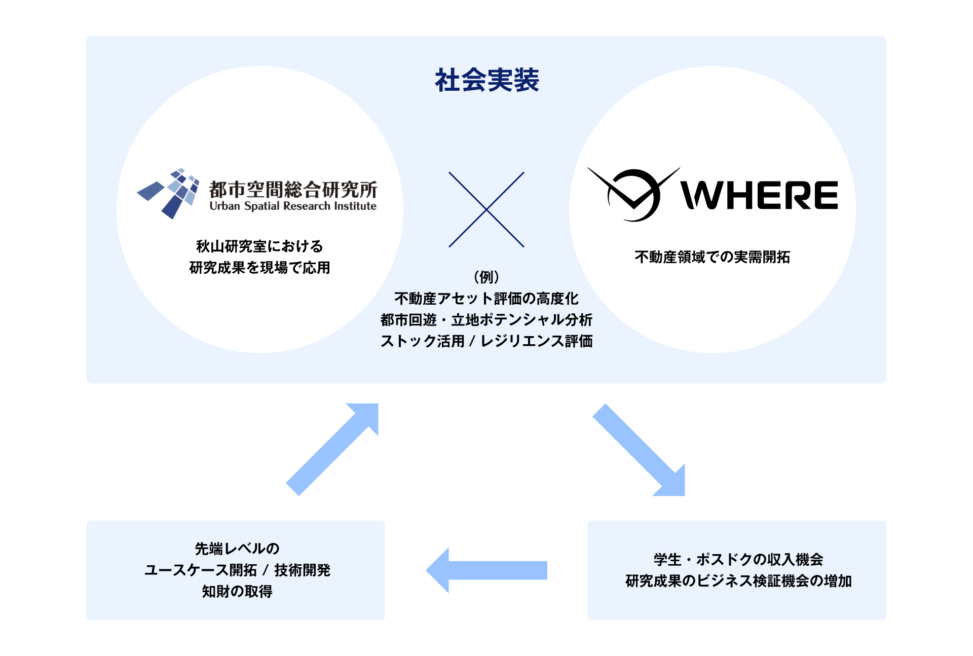 WHEREは不動産・都市開発領域での実案件を通じて社会実装の機会を創出し、都市空間総合研究所では空間情報科学・都市工学・AI解析の知見をもとに研究成果を現場で応用。両者の連携により、研究費が再投資され、人材育成と研究成果の創出が持続的に循環する「研究費 → 人材 → 成果」のスパイラルモデルを構築します。