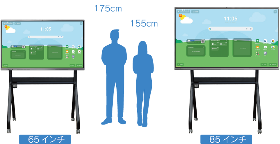 専用のスタンドに設置し、電源を入れるだけで利用可能です。Android OS搭載によりPCなしでもWeb会議アプリなどが動作するほか、HDMI接続による外部入力にも対応しています。
