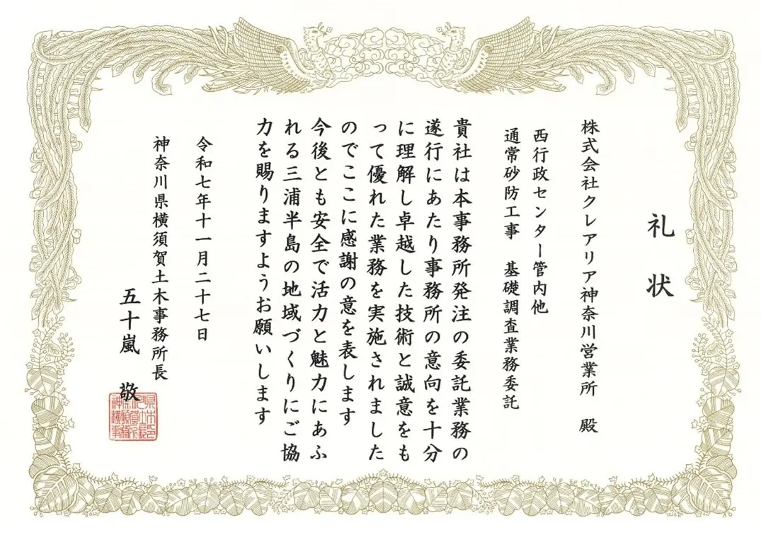本顕彰は、神奈川県横須賀土木事務所が発注した建設関連業務のうち、特に優れた技術力と誠実な業務遂行により、地域の安全・安心なまちづくりに大きく貢献した企業および管理技術者に贈られるものです。
