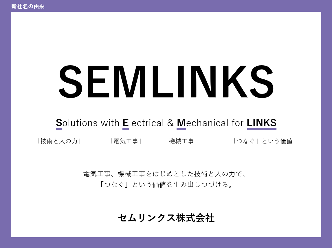 新社名の「セムリンクス」には、『電気工事、機械工事をはじめとした技術と人の力で、「つなぐ」という価値を生み出しつづける。』との想いを込めており、新社名のもと、大和ハウスグループの一員として、これまで培ってきた強みを活かしながら、より一層のサービス向上と新たな価値創造に努めてまいります。