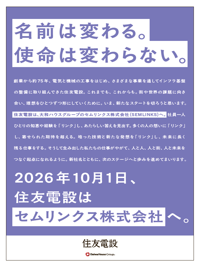 住友電設株式会社は、2026年10月1日付で、新社名を「セムリンクス」に変更することにいたしましたので、お知らせいたします。